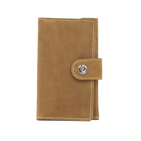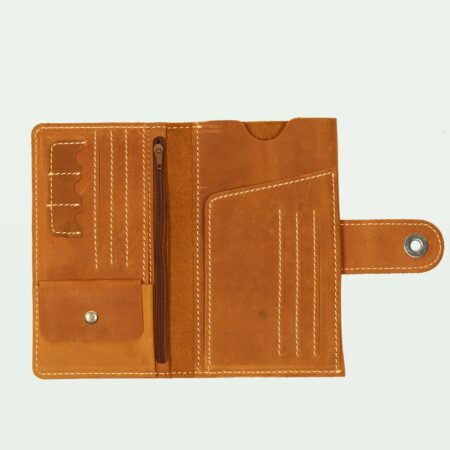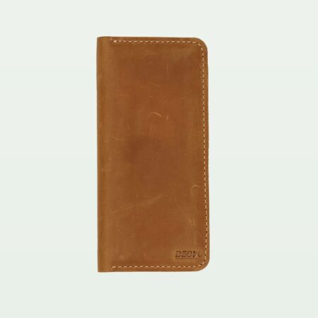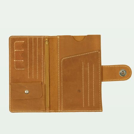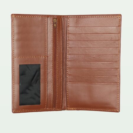 An elegant camel leather long wallet with eight card holders and a secure zip compartment.