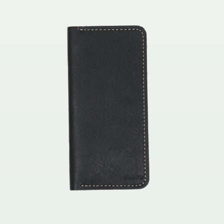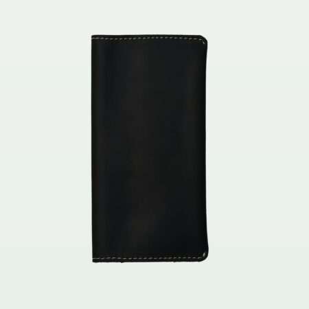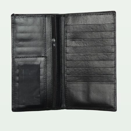 A sophisticated black leather long wallet with eight card holders, perfect for a professional look.