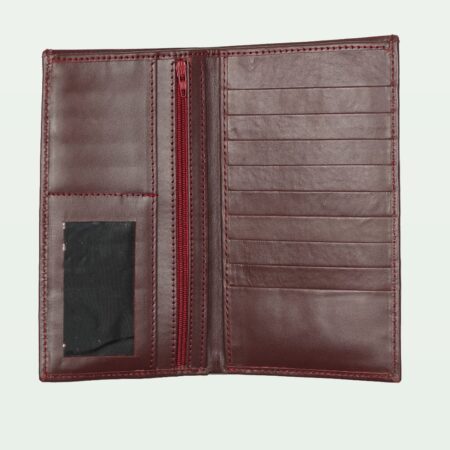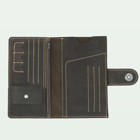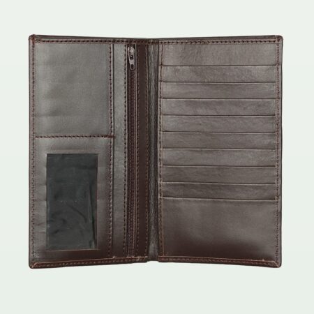 A sophisticated brown leather long wallet with eight card holders and a secure zip compartment.