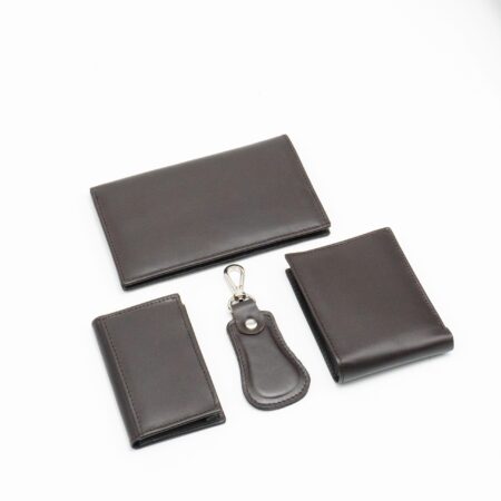 Brown 3-piece leather set featuring a wallet, keychain, and belt – warm, stylish, and ideal for gifting.
